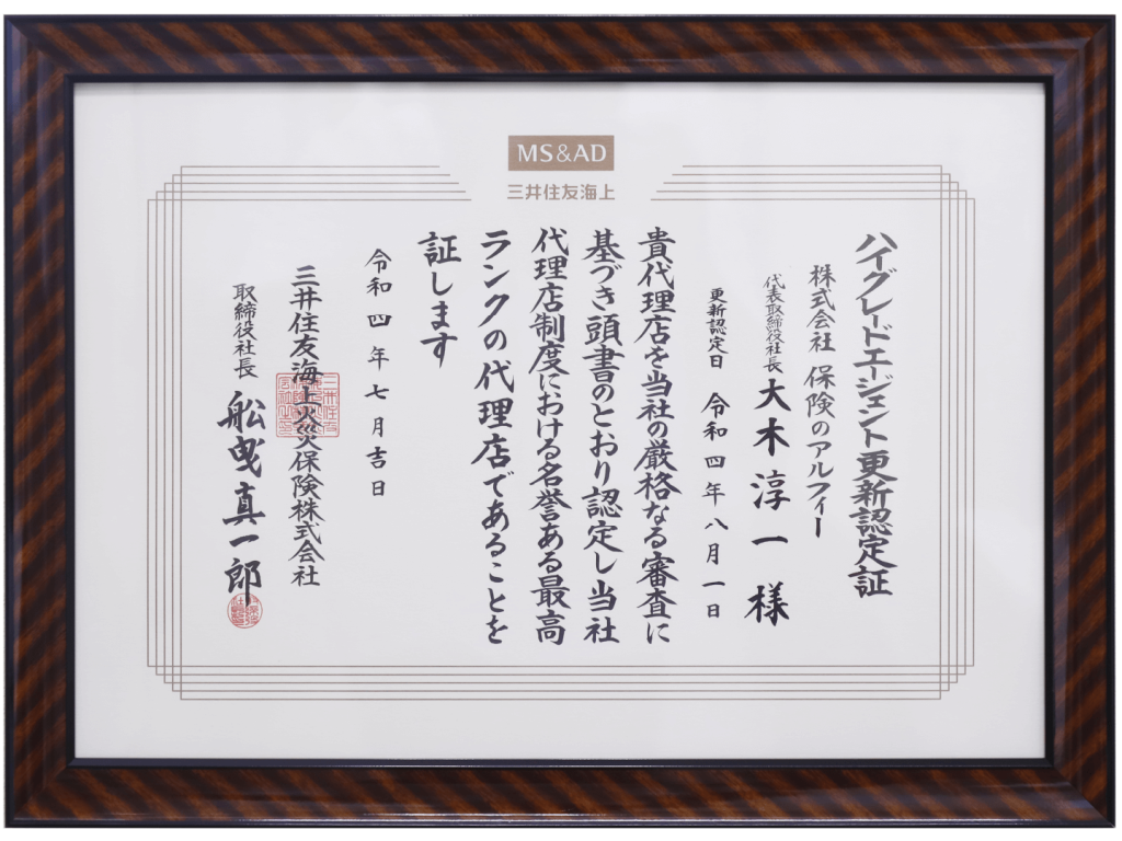 保険のアルフィーは三井住友海上の委託代理店の格付制度で、最高ランクの「HGA」の認定を受けた代理店です。